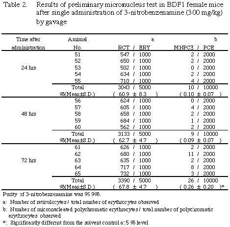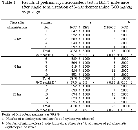 小核予備試験および小核本試験に用いる被験物質3−ニトロベンゼナミンの高用量を、雄雌ともに最大耐量の300 mg/kgに決定した。また、これをもとにして公比2で減じ、中用量を150 mg/kg、さらに低用量を75 mg/kgと決定した。