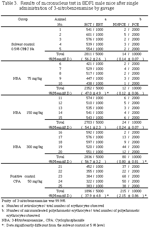 被験物質3−ニトロベンゼナミンの生体内における細胞遺伝学的影響を評価するために、Crj:BDF1雄および雌マウスを用いる強制経口投与による小核試験を実施した。結果は以下のように要約される。