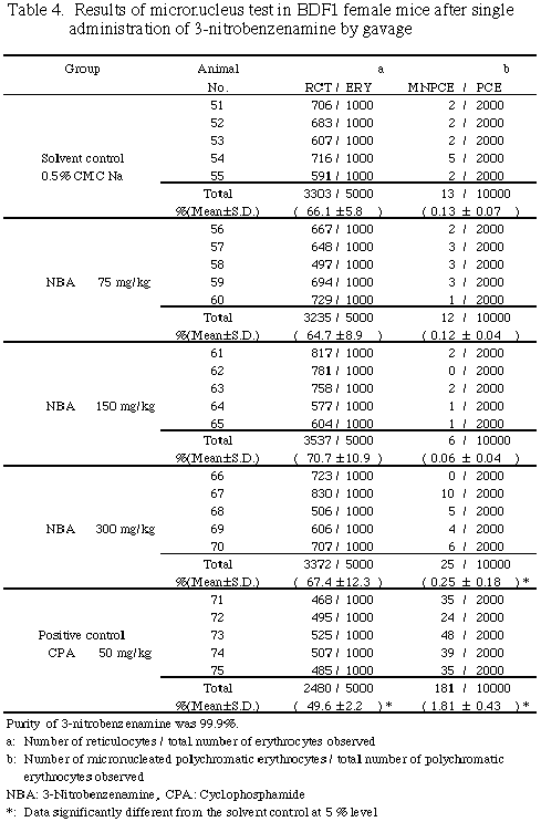 以上の結果から、3−ニトロベンゼナミンは、本試験条件下でBDF1雄マウスの骨髄細胞において、小核を誘発する作用があることを示した。また、骨髄細胞の増殖抑制作用は、雌雄ともに示さなかった。
