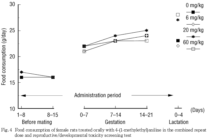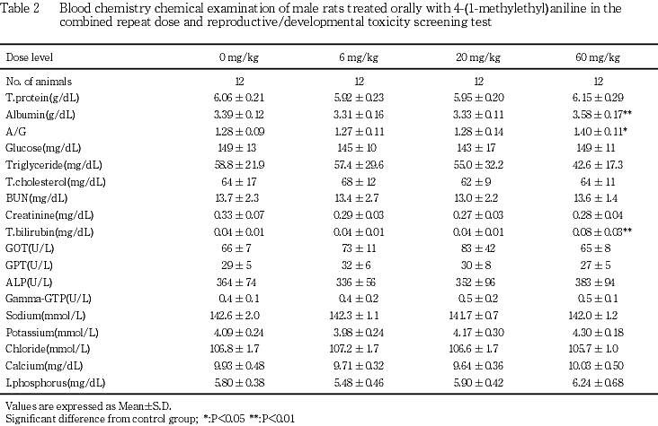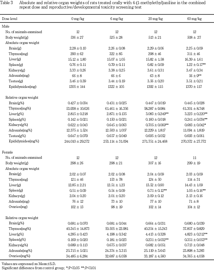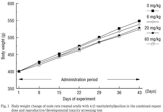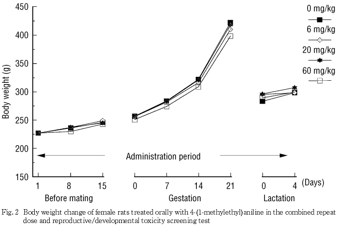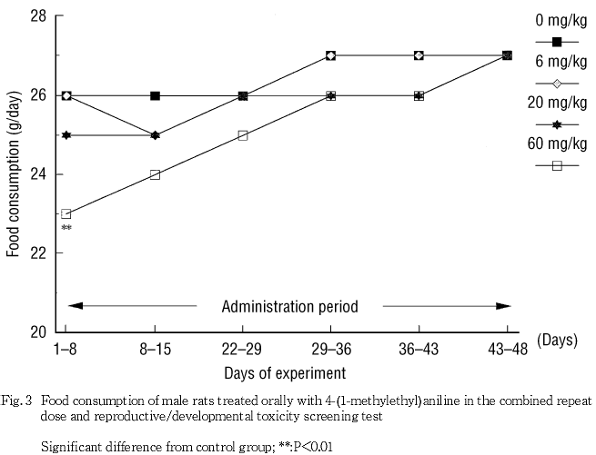 以上のことから,4-(1-メチルエチル)アニリンの雌雄の生殖能に及ぼす影響は60 mg/kg/day投与でも認められず,無影響量は60 mg/kg/dayと判断された.