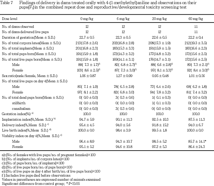 以上の結果から,本試験条件下では4-(1-メチルエチル)アニリンの反復投与によりメトヘモグロビン血症および貧血が惹起され,それらに起因すると考えられる一般状態,血液学検査値,血液生化学検査値,骨髄,肝臓および脾臓の変化が雌雄の20 mg/kg以上の投与群で認められ,無影響量(NOEL)は雌雄とも6 mg/kg/dayと判断された.雌雄の生殖能に及ぼす影響は60 mg/kg/day投与でも認められず,無影響量は60 mg/kg/dayと判断された.児動物の発生・発育に及ぼす影響は60 mg/kg/day投与で発育抑制が認められ,新生児の4日の生存率が低値を示したことから無影響量は20 mg/kg/dayと判断された.