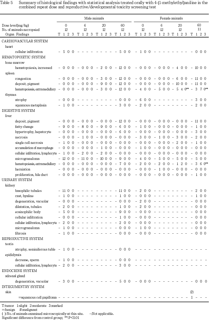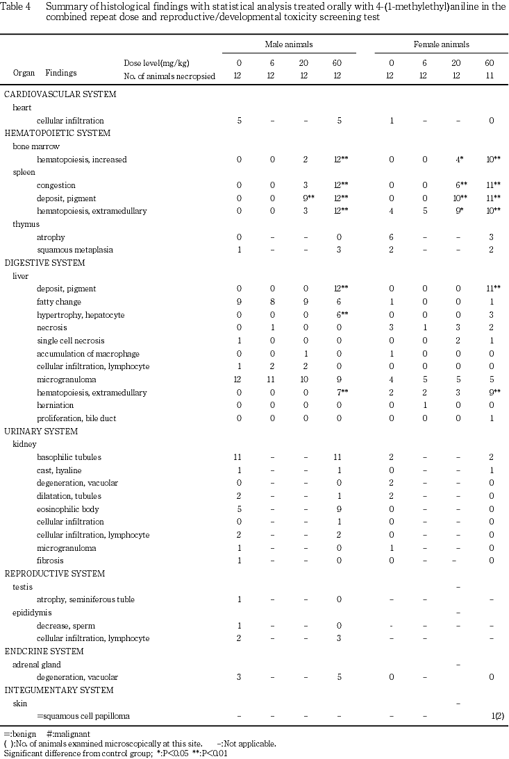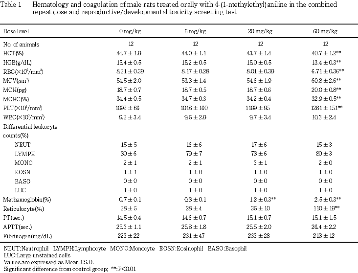 以上のことから,4-(1-メチルエチル)アニリンの反復投与によりメトヘモグロビン血症および貧血が惹起され,それらに起因すると考えられる一般状態,血液学検査値,血液生化学検査値,骨髄,肝臓および脾臓の変化が雌雄の20 mg/kg以上の投与群で認められ,無影響量は雌雄とも6 mg/kg/dayと判断された.