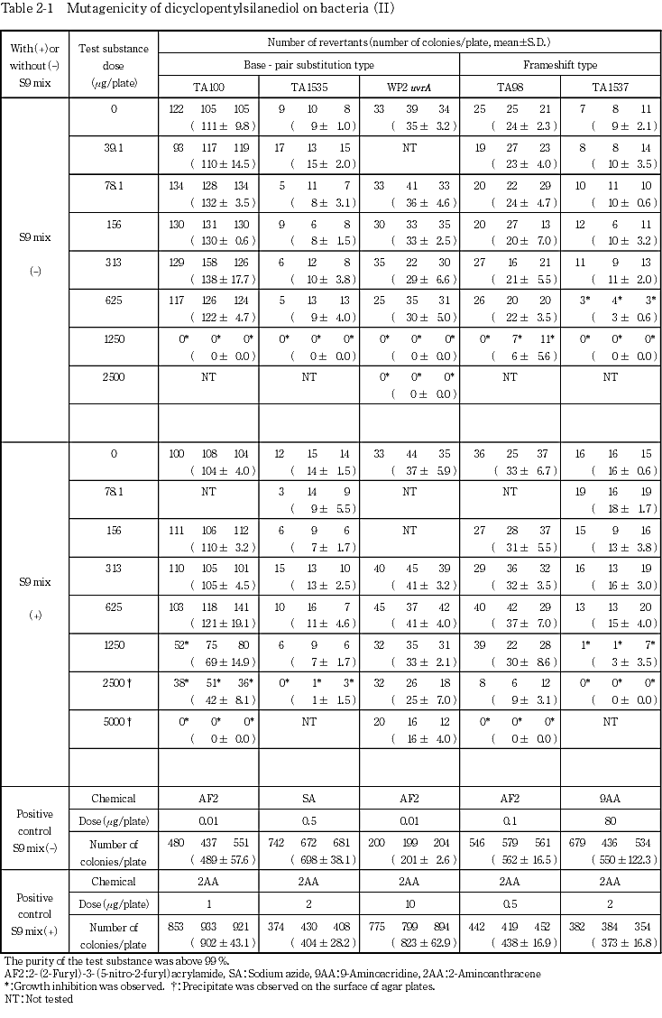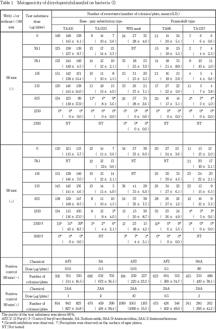 なおジシクロペンチルシランジオールは,当研究所で本試験と並行して実施したチャイニーズ・ハムスター培養細胞を用いる染色体異常試験では陰性であった4).また,関連物質であるシランについては,復帰変異試験で陽性の結果が5),メチルトリクロロシランについては,染色体異常試験で陰性の結果が,ジメチルジクロロシランとトリメチルクロロシランについては,染色体異常試験で陽性の結果が得られている6).
