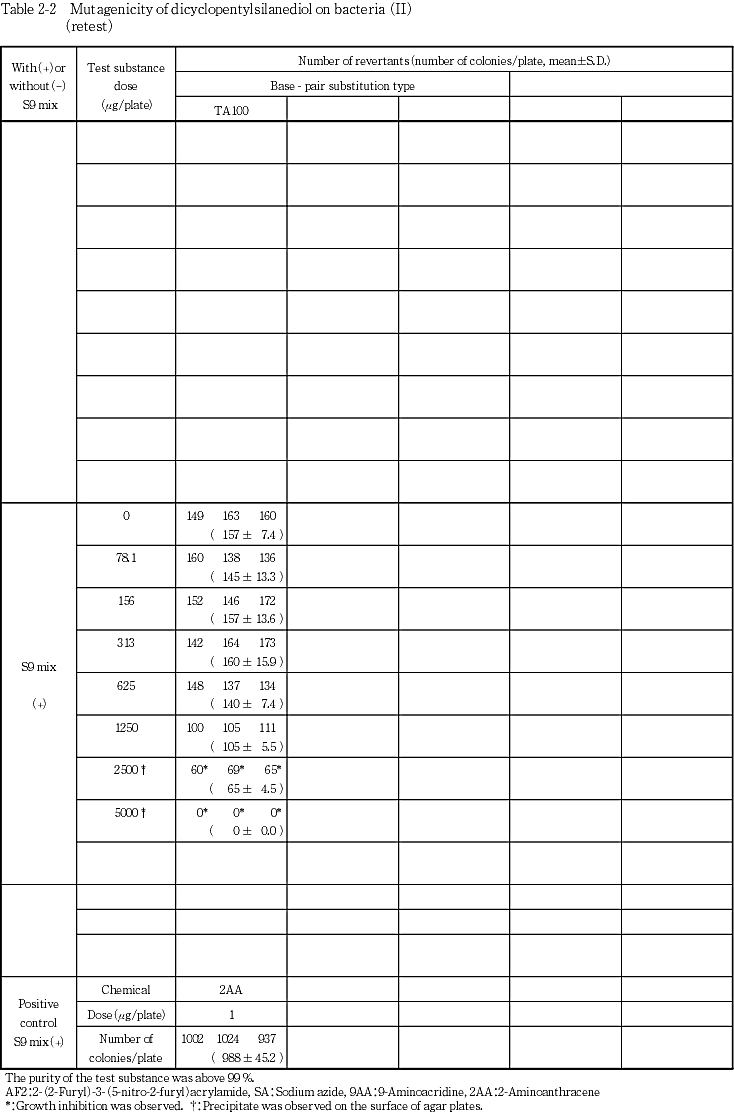 以上の結果から,ジシクロペンチルシランジオールは,用いた試験系において変異原性を有しないもの(陰性)と判定した.